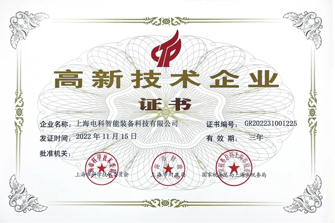 2022年11月15日,上電科智能裝備榮獲由上海市科學(xué)技術(shù)委員會、上海市財政局和國家稅務(wù)總局上海市稅務(wù)局聯(lián)合頒發(fā)的“高新技術(shù)企業(yè)”認(rèn)定證書,由此上電科智能裝備正式邁入國家高新技術(shù)企業(yè)行列。
