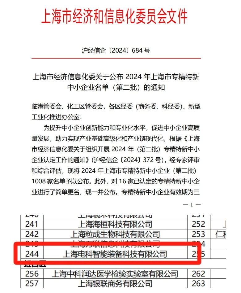 近日,上海市經(jīng)濟和信息化委員會發(fā)布第二批2024年上海市級專精特新中小企業(yè)名單,“上海電科智能裝備科技有限公司”憑借其在智能制造領域的卓越表現(xiàn)和技術創(chuàng)新實力成功入選,成為上海市“專精特新”中小企業(yè)。
