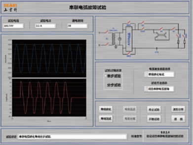 并聯(lián)電弧故障試驗(yàn),按標(biāo)準(zhǔn)要求測(cè)量在0.5s內(nèi)電弧的半波數(shù),配置電纜切割裝置和碳化電纜裝置;