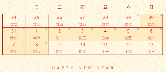 2022春節(jié)即將到來(lái),根據(jù)國(guó)務(wù)院辦公廳相關(guān)放假通知,結(jié)合集團(tuán)公司實(shí)際情況,現(xiàn)對(duì)春節(jié)放假安排如下安排